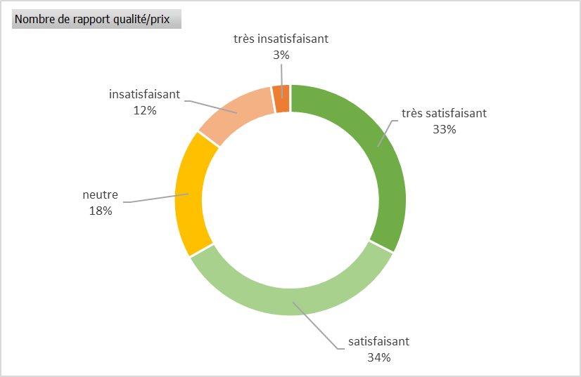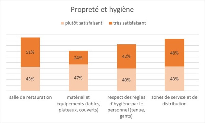 Il ressort de cette enquête que les agents apprécient particulièrement l’accueil et l’amabilité du personnel (88% de réponses positives), les plats équilibrés (74 % de réponses positives), le rapport qualité/prix (67 % de réponses positives), l’affichage et la traçabilité des produits (74 % de réponses positives), la qualité des repas (65 % de réponses positives) ainsi que la propreté et le respect des règles d’hygiène (84 % de réponses positives).