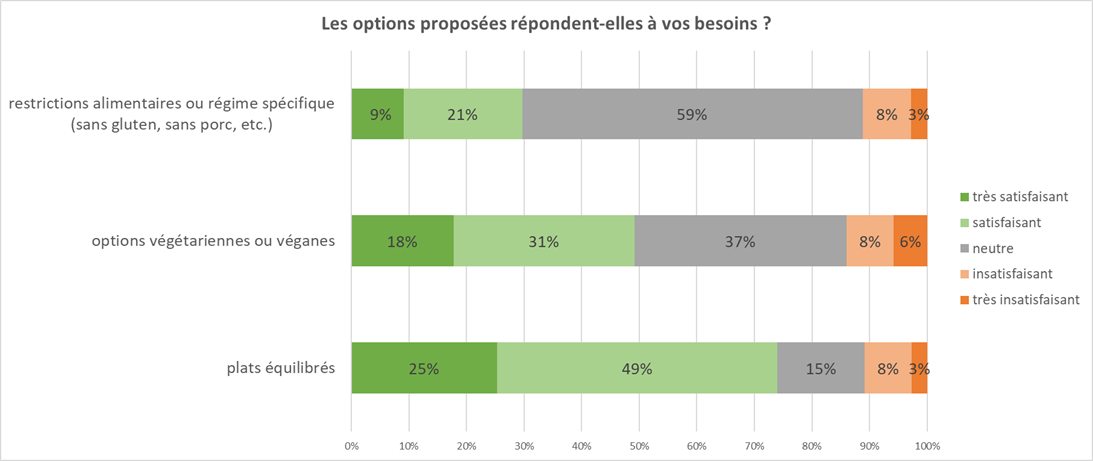 Si le rapport qualité/prix est généralement salué par les agents qui se déclarent satisfaits ou très satisfaits à 67 %, certains agents disent être prêts à payer un peu plus en échange de portions plus importantes et d’une gamme de choix plus large.