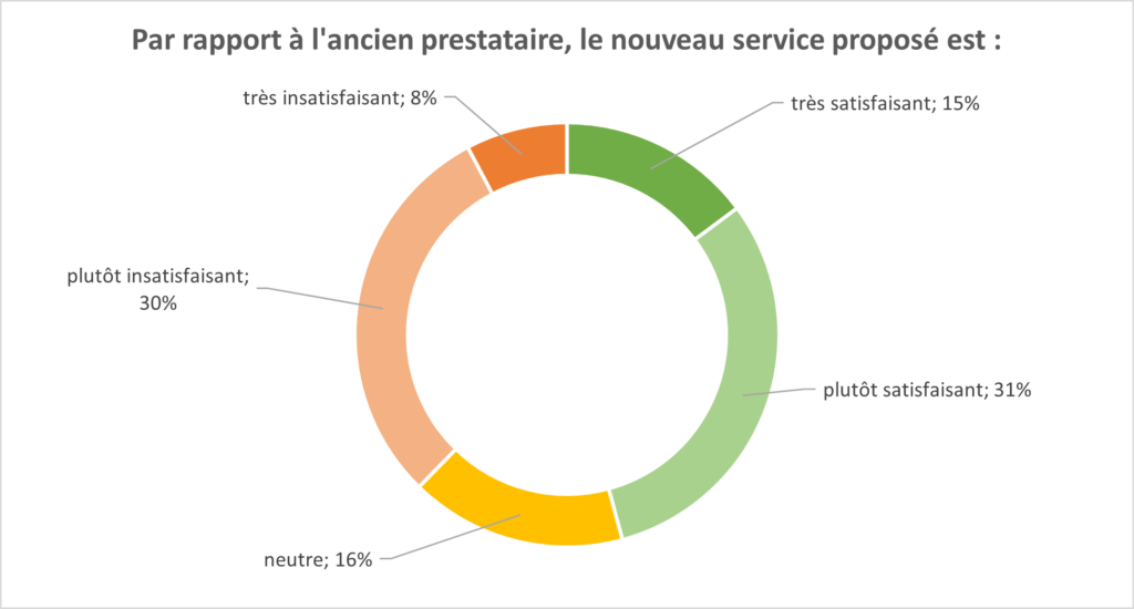 Enfin, en comparaison avec le précédent prestataire, les répondants sont très satisfaits ou satisfaits à 46 %, 16 % ont une position neutre et 38 % se déclarent plutôt insatisfaits ou très insatisfaits.