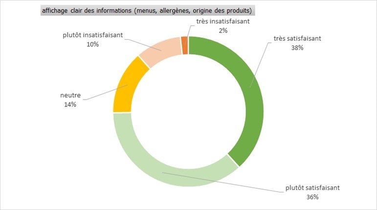Concernant l’affichage des informations relatives aux menus, allergènes et origines des produits, 12 % des répondants se disent plutôt insatisfaits ou très insatisfaits et 74 % se déclarent très satisfaits ou plutôt satisfaits.