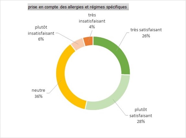 Plus de la moitié des agents sont satisfaits de la prise en compte des allergies et régimes spécifiques : 26 % sont très satisfaits et 28 % plutôt satisfaits.