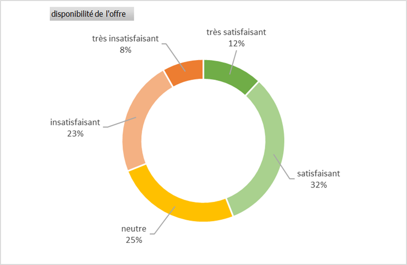 La satisfaction concernant la disponibilité de l’offre est modérée : 44 % des répondants sont très satisfaits ou satisfaits. De nombreux répondants ne cachent pas leur déception face à la pénurie de certains aliments au cours du service (pain, frites, etc.) ou à l’indisponibilité d’une partie des plats à partir de 12h30.