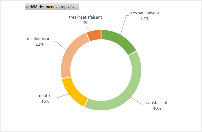 57 % des agents sont satisfaits et très satisfaits par la variété des menus, néanmoins, ils sont nombreux à demander un peu plus de choix pour les entrées et desserts mais avec des options plus « classiques » ou « traditionnelles » ; ils souhaiteraient également une alternance entre les plats actuels originaux ou élaborés et des plats plus « classiques » ou « familiaux ».