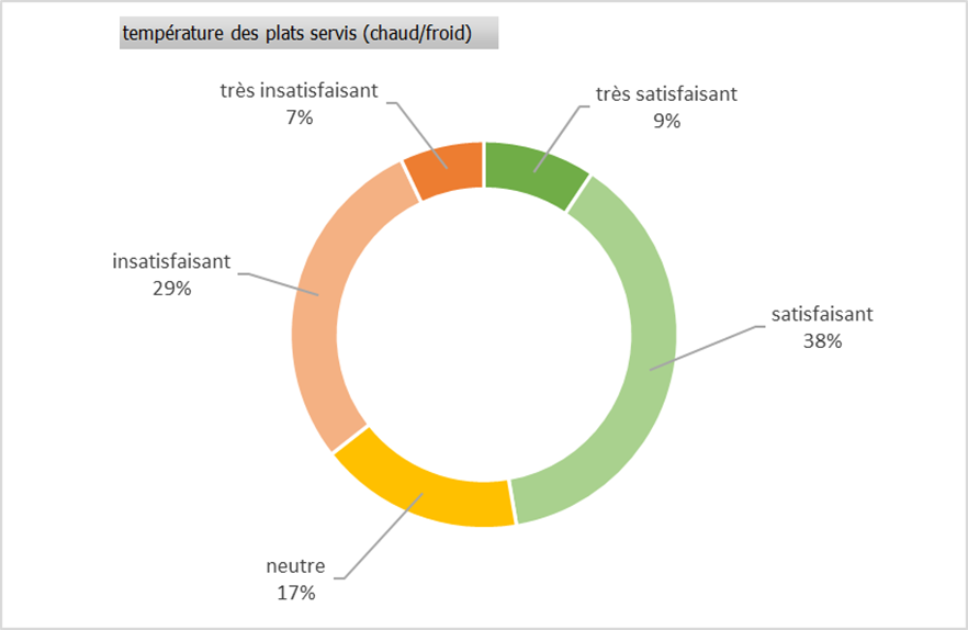 Le taux de satisfaction baisse à 47 % lorsque l’on évoque la température des plats servis et le temps d’attente ; ces deux thématiques faisant l’objet de nombreuses observations :