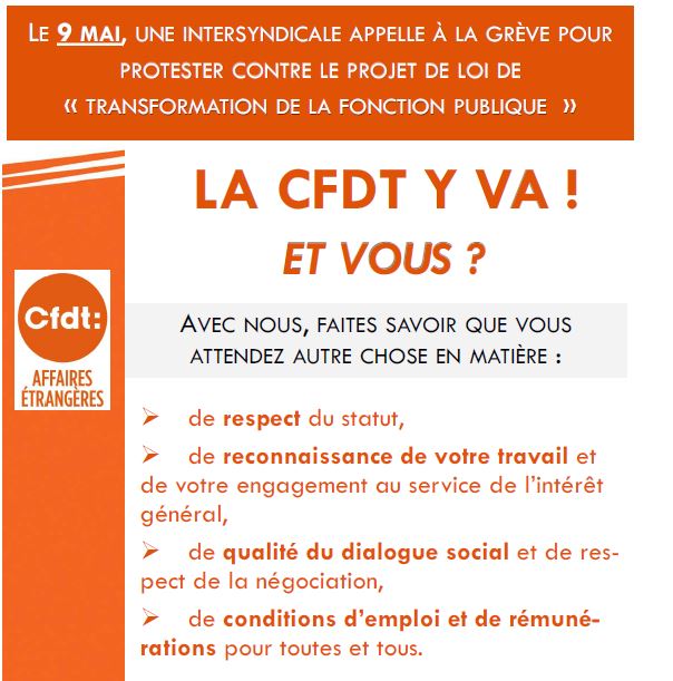 Contactez votre permanence CFDT-MAE (Paris ou Nantes) pour en savoir plus ou écrivez à cfdt.mae@diplomatie.gouv.fr et retrouvez notre tract en pièce jointe !