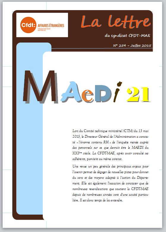 Dans ce numéro de la lettre du syndicat vous trouverez les propositions de la CFDT-MAE dans le cadre du projet MAEDI 21