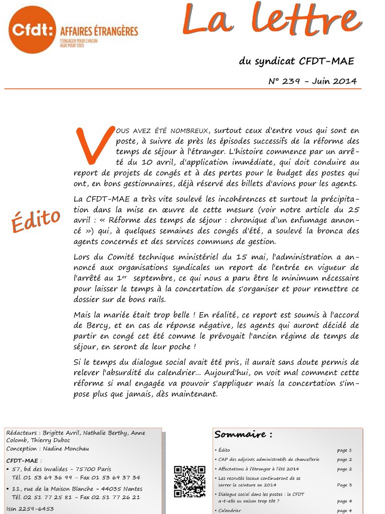 Lettre du syndicat n° 239 18 juin 2014 Partager cet articleFacebook0Twitter0Google+0 LDS n°239 Edito. CAP des adjoints administratifs de chancellerie · Affectations à l’étranger à l’été 2014 · Les recrutés locaux continueront de se serrer la ceinture en 2014 · Dialogue social dans les postes : la CFDT a-t-elle eu raison trop tôt ? Calendrier LDS_239___juin_2014_2.pdf Fichiers à télécharger lds 239 - copie • 27 kB • 92 téléchargementlds239 • 428 kB • 988 téléchargement1f927a512a9909833c7b57ab40062fc5 • 427 kB • 99 téléchargementLDS_239___juin_2014_2 • 428 kB • 1010 téléchargement