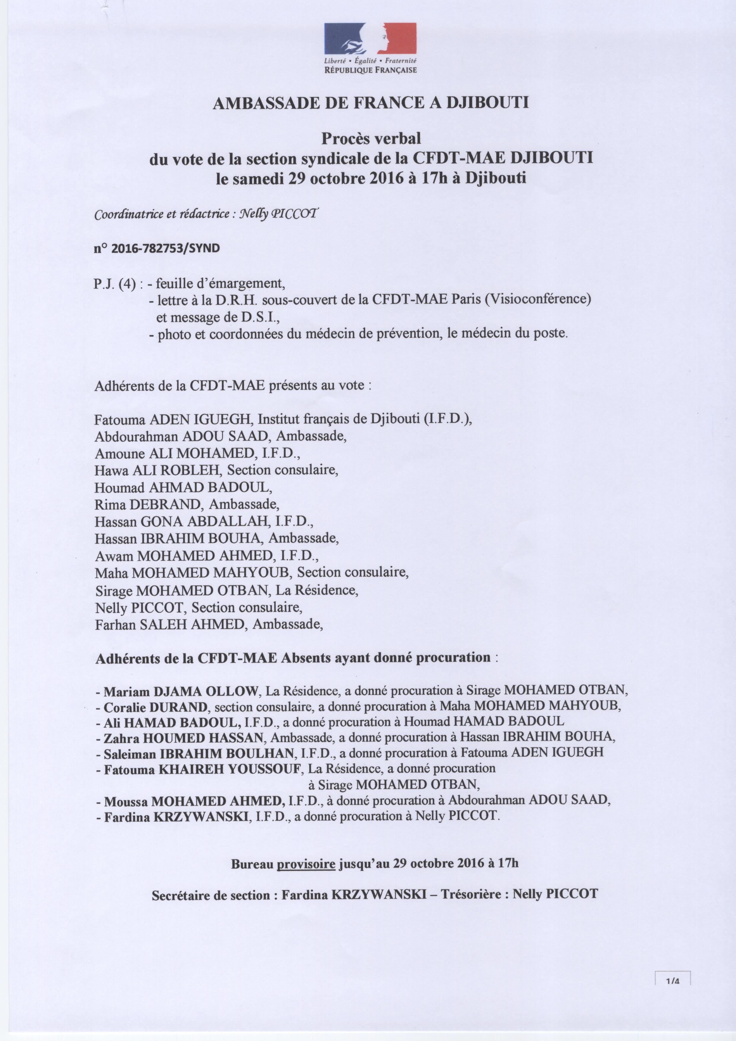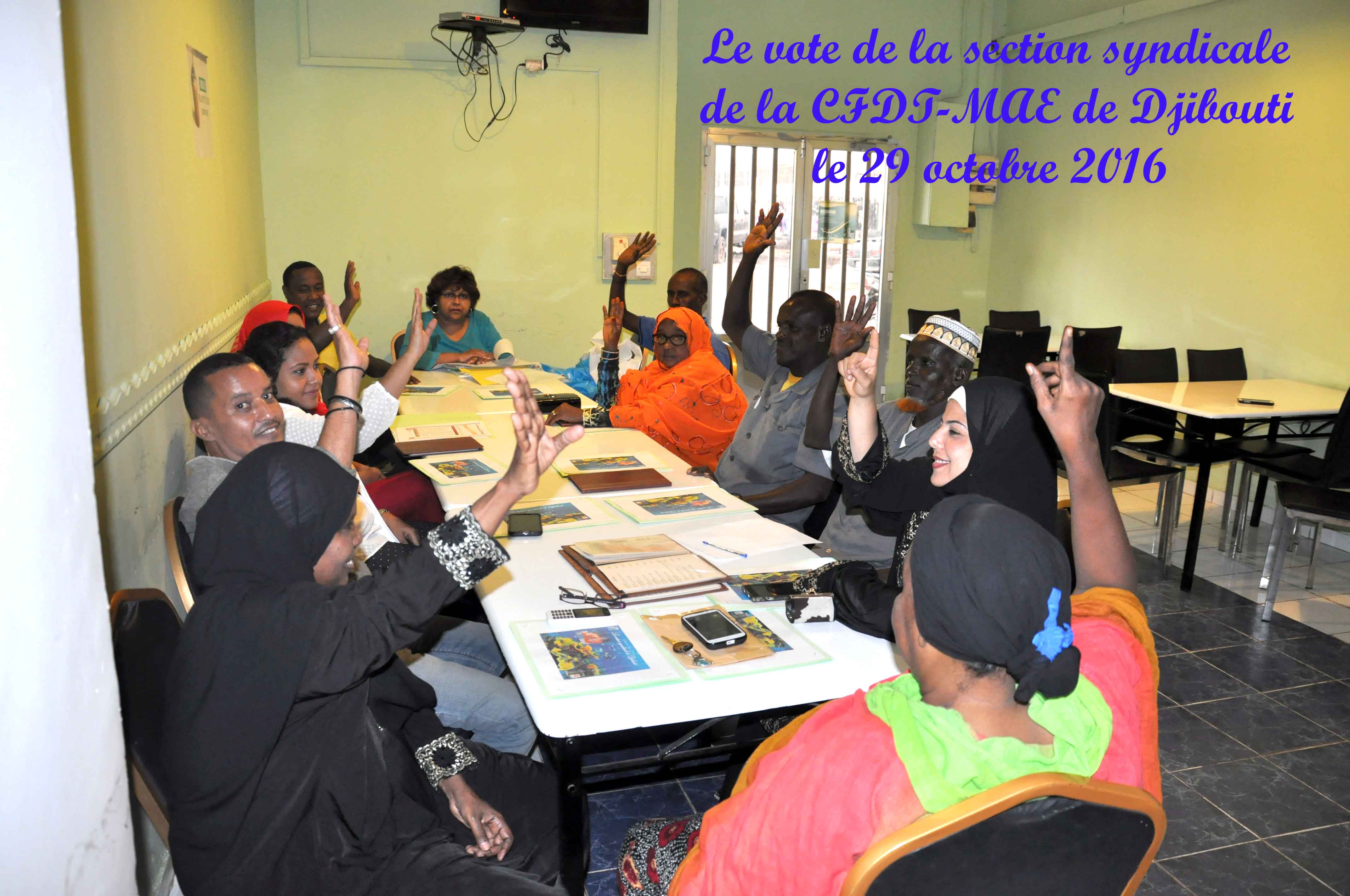 Une section syndicale CFDT-MAE a été créée à Djibouti le samedi 29 octobre 2016. Le bureau est composé d’une secrétaire de section : Nelly PICCOT et de la trésorière : Rima DEBRAND. Les premières revendications de la section syndicale à Djibouti concernent les questions d’hygiène, sécurité et conditions de travail et la mise en place à Djibouti d’un système de visio-conférence accessible à l’ensemble des services et des organisations syndicales.