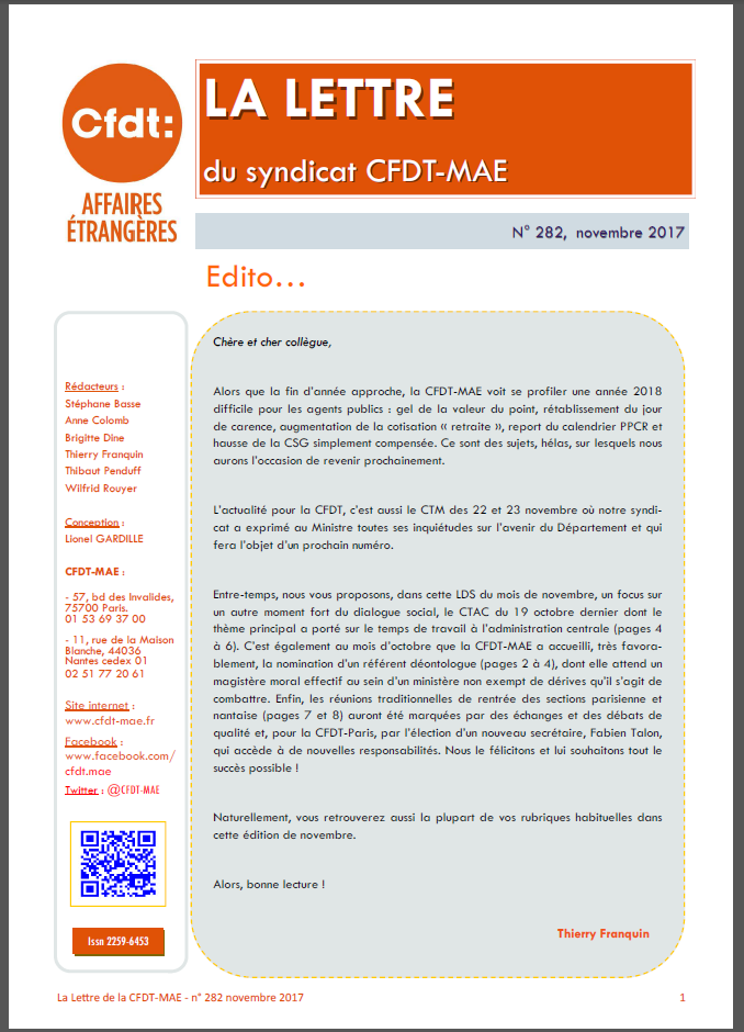 Rencontre avec le référent déontologue ; le temps de travail à l’honneur au CTAC ; AG des sections nantaise et parisienne. La LDS de novembre est en ligne ! 30 novembre 2017 Partager cet articleFacebook0Twitter0Google+0LDS de novembre 2017 Fichiers à télécharger LDS de novembre 2017 • 912 kB • 1499 téléchargementCapture • 155 kB • 82 téléchargement