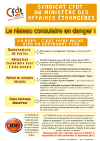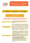 Réseau consulaire en danger ! 19 janvier 2010 Partager cet articleFacebook0Twitter0Google+0La CFDT dénonce une RGPP désastreuse. Voir, afficher et faire circuler tract et affiche… sans modération ! Voir l’affiche Voir le tract Fichiers à télécharger affichereseauconsulaire • 460 kB • 1378 téléchargementvignetteaffiche reseau consulaire • 21 kB • 86 téléchargementtractreseauconsulaire • 510 kB • 1421 téléchargementvignettetractresseau • 16 kB • 90 téléchargement