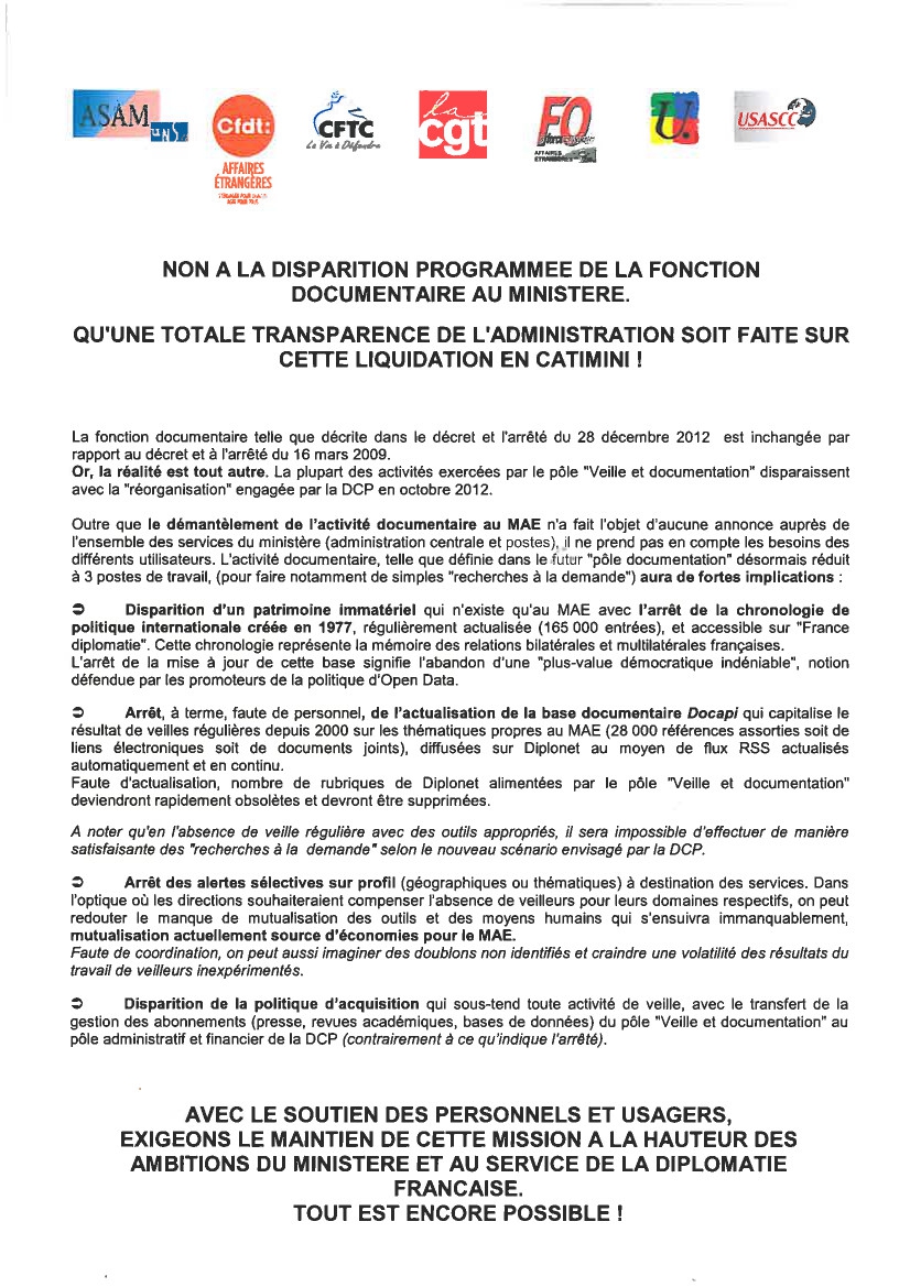 Lors du comité technique ministériel (CTM) de décembre 2012, la question du pôle Infodoc avait été abordée à la demande de la CGT et de la CFDT, qui avaient été alertées sur une réorganisation entreprise dans de mauvaises conditions et sur le malaise qui régnait dans ce service. Le directeur DCP avait accepté le principe d’une réunion de dialogue social pour mieux cerner le problème.