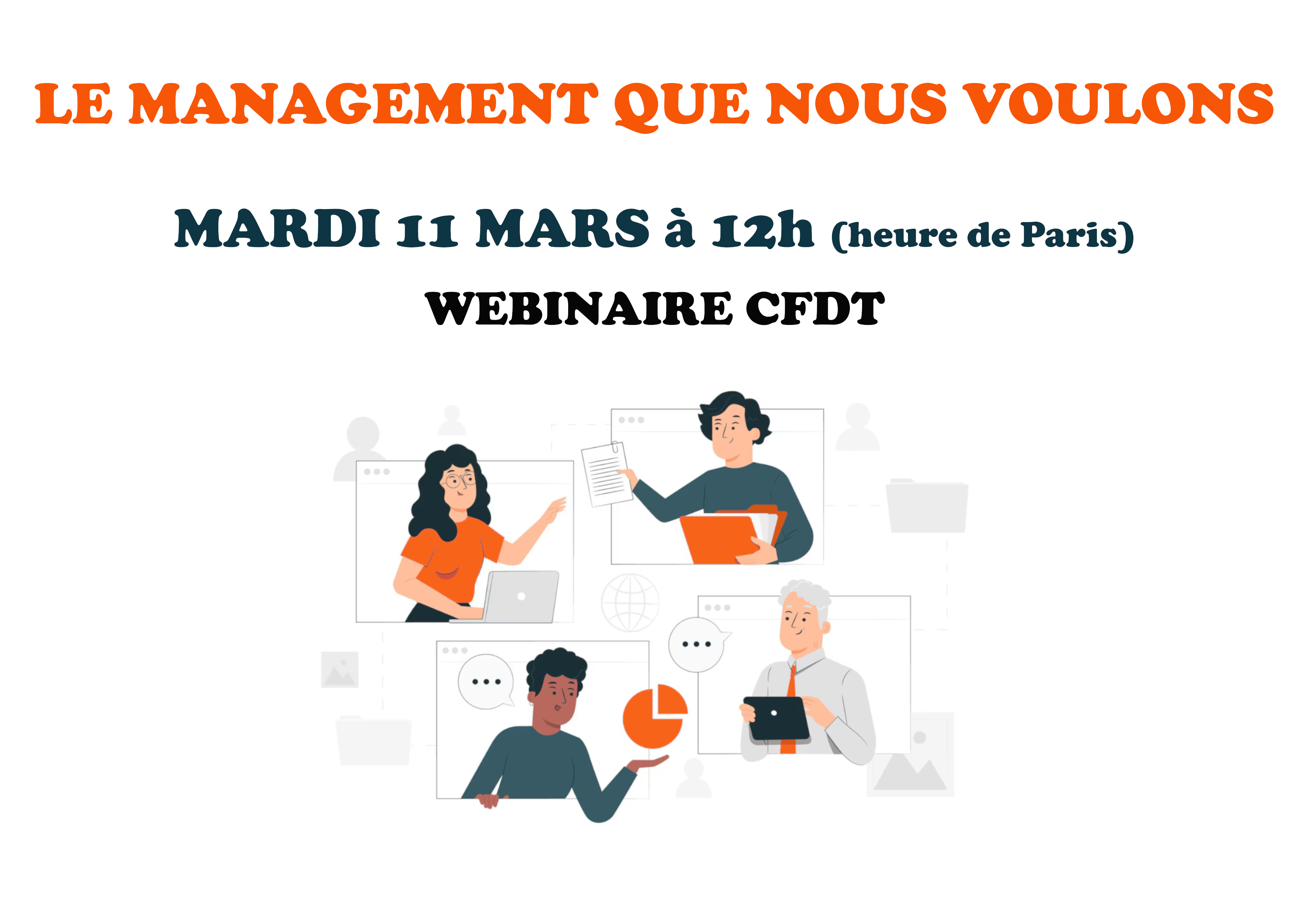Dans la continuité du succès de notre grande enquête portant sur les pratiques managériales au MEAE, l’équipe CFDT-MAE vous donne rendez-vous le mardi 11 mars pour échanger avec vous sur le sujet en présence de responsables syndicaux nationaux :