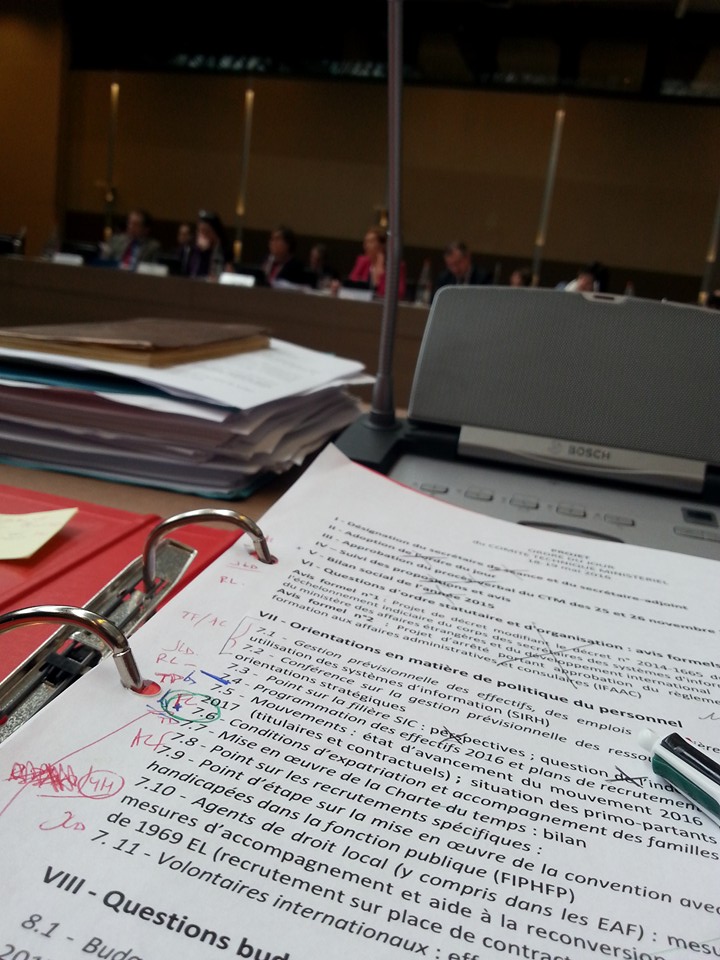 Puis il prononce le discours, au nom du ministre, dont on retiendra que ce dernier est très préoccupé par les efforts budgétaires supplémentaires demandés au MAE en 2017, qu’il a bien pris en compte la question des recrutés locaux – qui ne bénéficieront pas de la revalorisation du point d’indice et pour lesquels « il faut aller plus loin que le droit local quand celui-ci n’est pas assez protecteur » -, la nécessité de construire une vision RH à long terme avec la GPEEC, la prévisibilité encore insuffisante des affectations à l’étranger, le renforcement de  la sécurité en poste – qu’il a évoquée avec le Président de la République et qui donnera lieu à un « plan d’action ambitieux », la conciliation entre vie personnelle et vie professionnelle – « l’enjeu de la Charte du temps est de changer les mentalités » -, et enfin « l’exemplarité des encadrants et la lutte contre les comportements inadmissibles ».