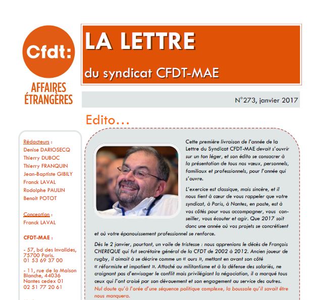 Le numéro 273 (janvier) de la Lettre du Syndicat CFDT-MAE est en ligne !