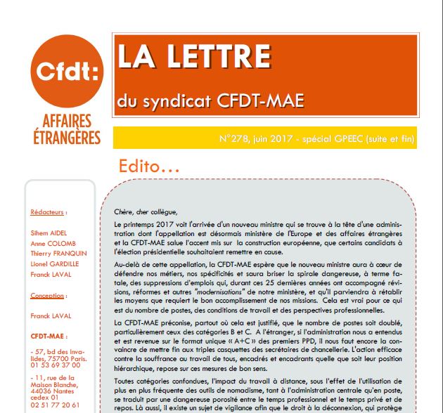 Découvrez ci-dessous, dans la « Lettre du syndicat CFDT-MAE » de ce mois de juin 2017 tout ce que vous vouliez savoir sur la GPEEC (gestion prévisionnelle des emplois, des effectifs et des compétences) des catégories A et des domaines politique, culturel, immeubles et logistique, presse !