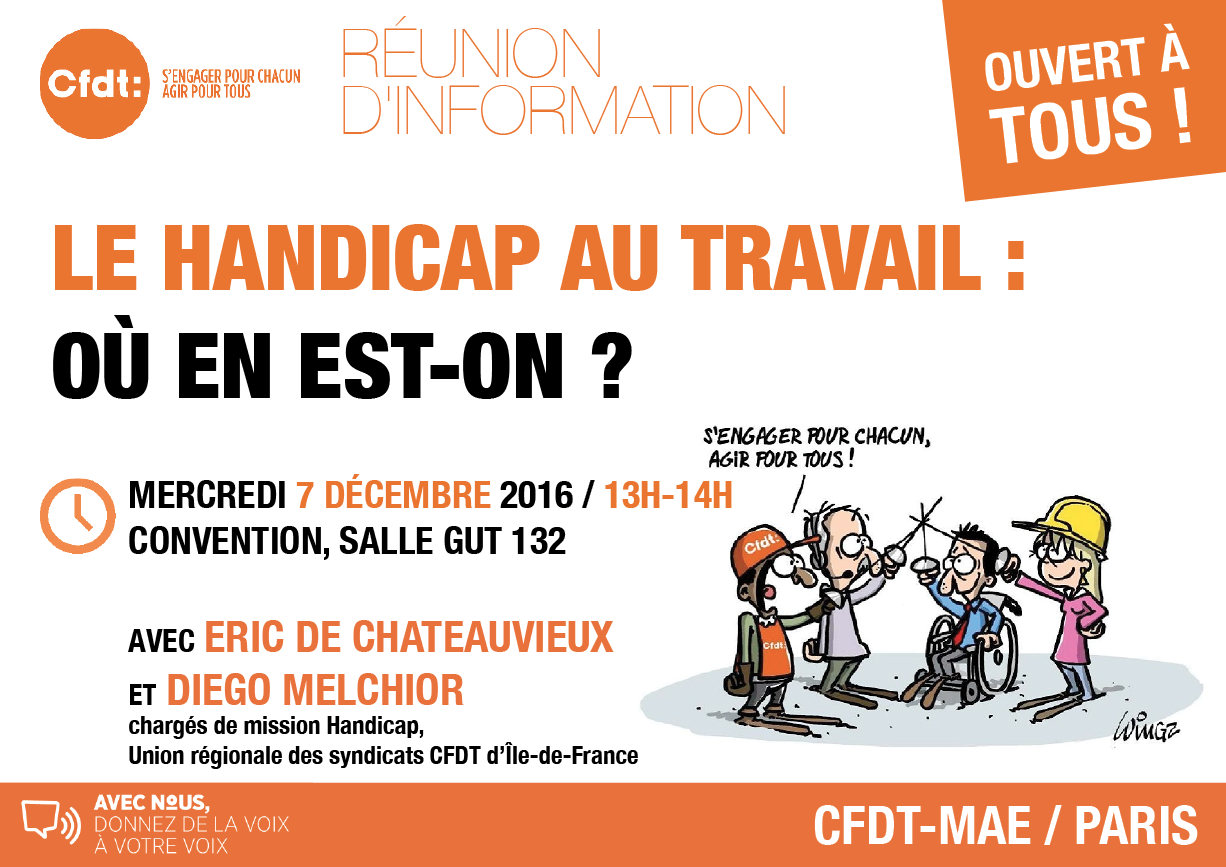 Dans le cadre de la Journée Internationale du Handicap, la section parisienne de la CFDT-MAE organise une Heure Mensuelle d’Information le mercredi 7 décembre de 13 h à 14h à Convention, en salle GUT 132.