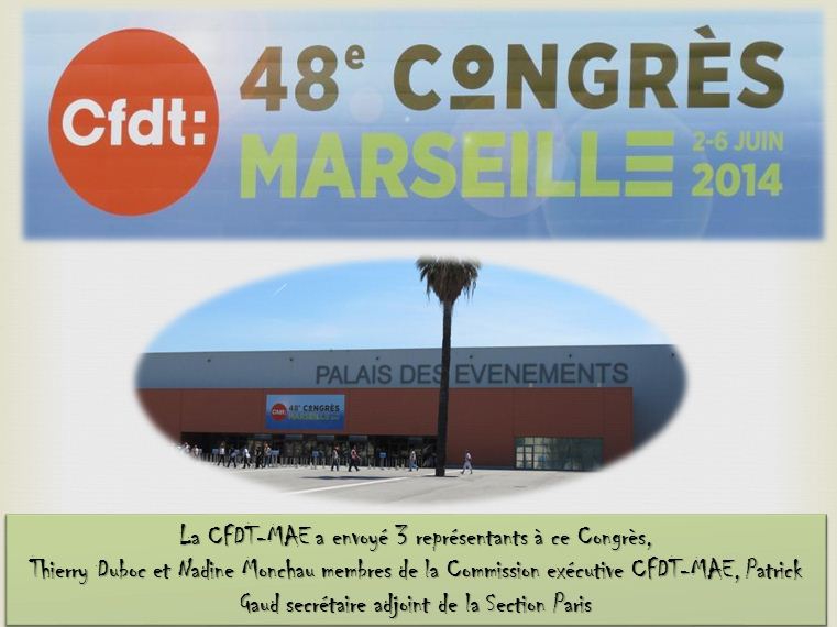 Le syndicat CFDT-MAE avait envoyé trois représentants au 48ème congrès confédéral, congrès historique puisqu’il marquait le 50è anniversaire de la CFDT : Nadine Monchau (porteuse de mandats) et Thierry Duboc, membres de la commission exécutive du syndicat ainsi que Patrick Gaud, secrétaire-adjoint de la section syndicale des adhérents parisiens.