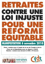 L’Assemblée nationale et le Sénat ont voté la loi sur les retraites. Il n’en demeure pas moins que cette loi est profondément injuste. Elle ne règle pas le problème des retraites par répartition. Les salariés l’ont compris, une forte proportion de la population française aussi, et leur soutien aux organisations syndicales reste fort comme l’a prouvé la belle participation à la manifestation du 28 octobre, malgré la période des vacances. C’est pourquoi, les organisations syndicales CFDT, CGC, CFTC, CGT, FSU et UNSA ont décidé d’une nouvelle journée de mobilisation. Afin que les salariés du privé puissent y participer massivement, elle aura lieu le samedi 6 novembre 2010.Paris : rendez-vous à l’angle de la rue du Temple et de la Place de la République pour un départ à 14h30