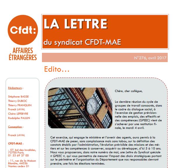 Le numéro 276 (avril 2017) de la Lettre du Syndicat CFDT-MAE est en ligne !