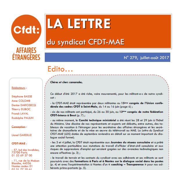La « Lettre du syndicat CFDT-MAE » de ces deux mois d’été 2017 est en ligne !